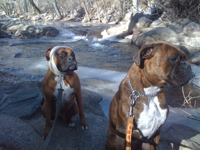 It was a pretty nice day here yesterday. The temp got up to about 60 degrees and thats unusual for this time of the year. I should have been able to leave the pups at home except for Whitney’s ear. She had a wart like growth on it that needed to be removed so Julie and I performed some minor surgery. The only problem with it is that it was on her ear and head wounds tend to bleed, alot. As I recall the Clyde and Katie incident from a few years ago, small wounds on ears are notoriously hard to clot. Removing the wart was easy, keeping Whitney from shaking her head and re-opening the clot was not so easy. I ended up with the solution you see in the picture. But, after the wound had clotted several times I used New Skin instead of a gauze bandage. This way I could use the ace bandage only and just keep her ear from moving around when she shook her head. We also avoided the need to buy a cone. She wasn’t able to escape looking a little silly though.